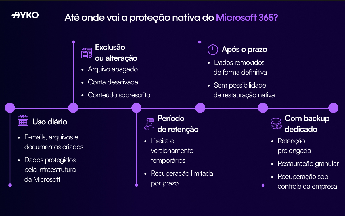 Os mecanismos nativos do Microsoft 365, como lixeira, versionamento e retenções temporárias, foram criados para situações pontuais, não para cenários críticos de continuidade. Eles têm prazos limitados e restrições de granularidade na restauração.